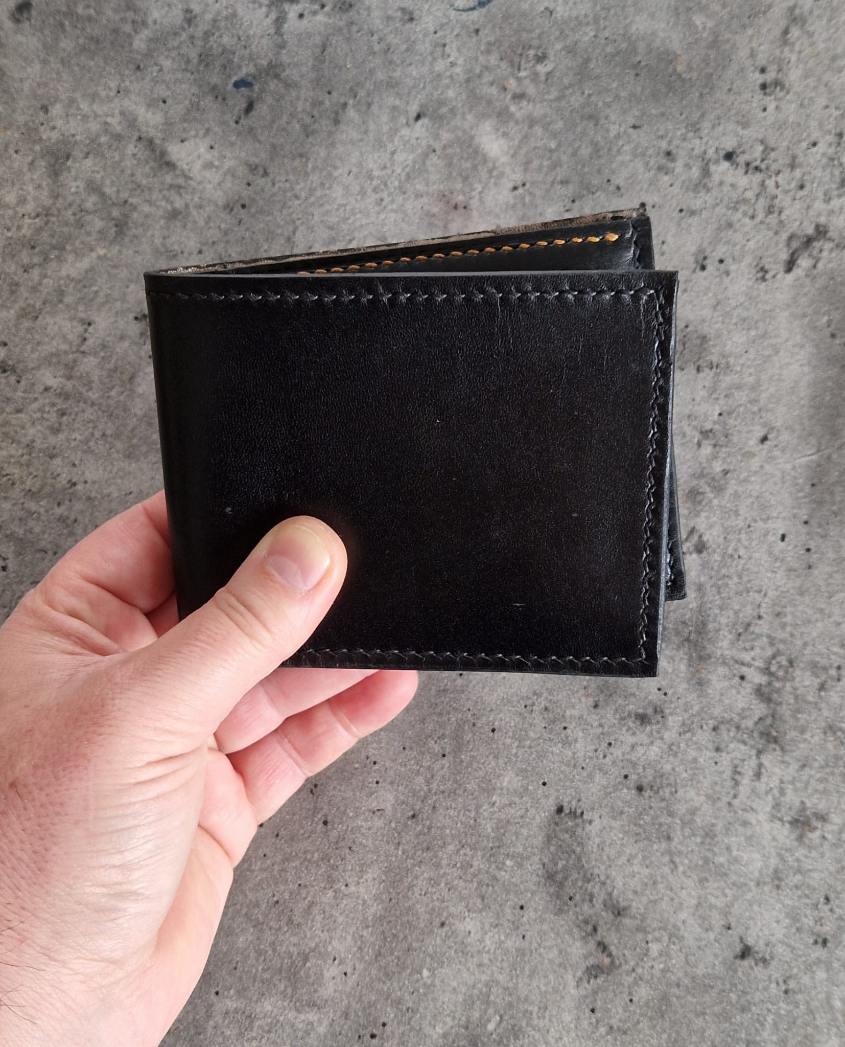 The wallet uses traditional stitching techniques done by me, with premium black and yellow waxed thread. The interior of the wallet is lined with smooth full-grain leather and yellow accents, ensuring durability and a refined, vibrant appearance. The layout also includes three credit card slots on each side, hidden pockets underneath for additional storage, and a main banknote compartment at the back which has been crafted in an unique, shiny material leather.